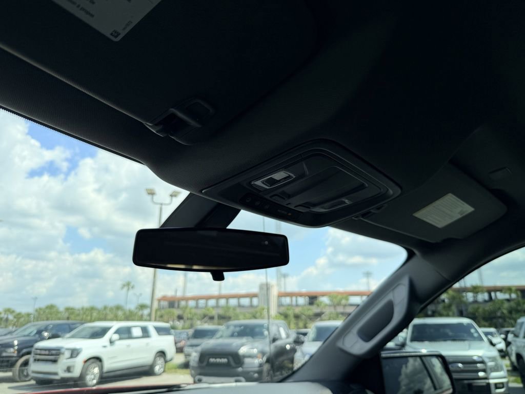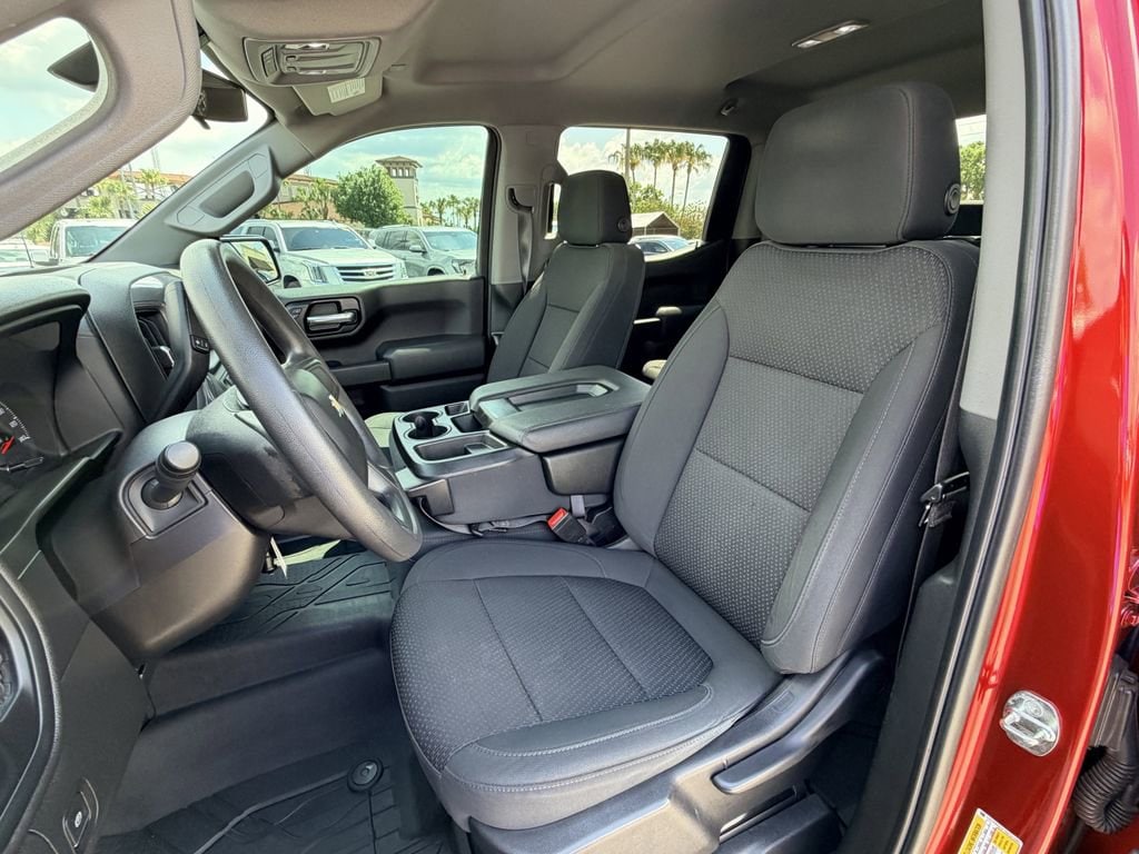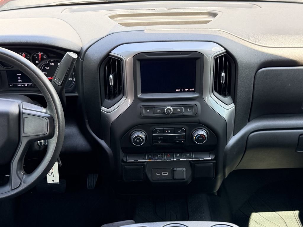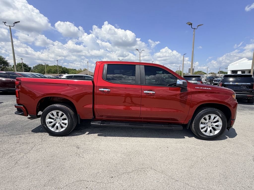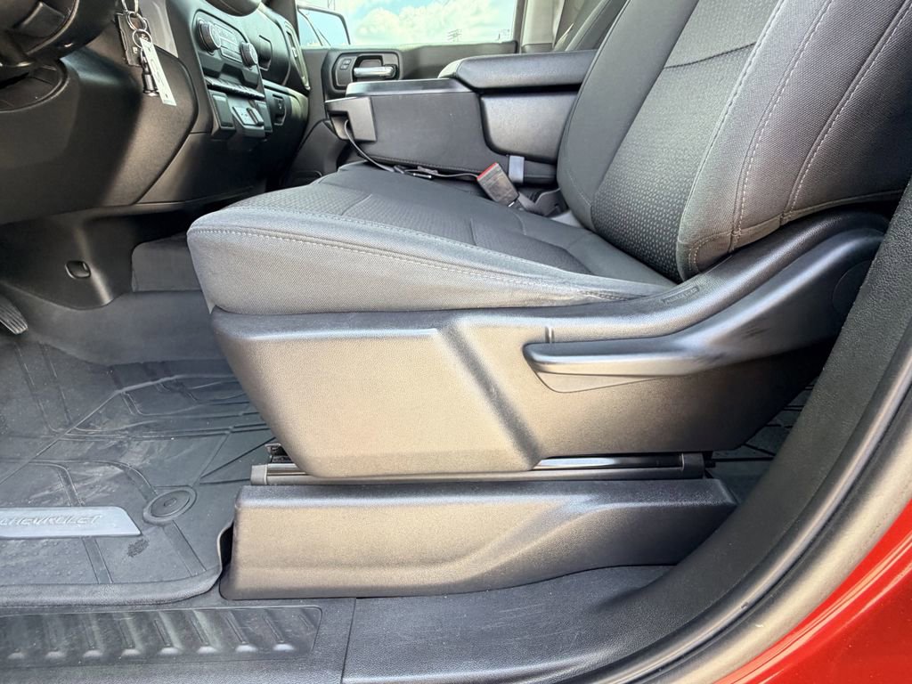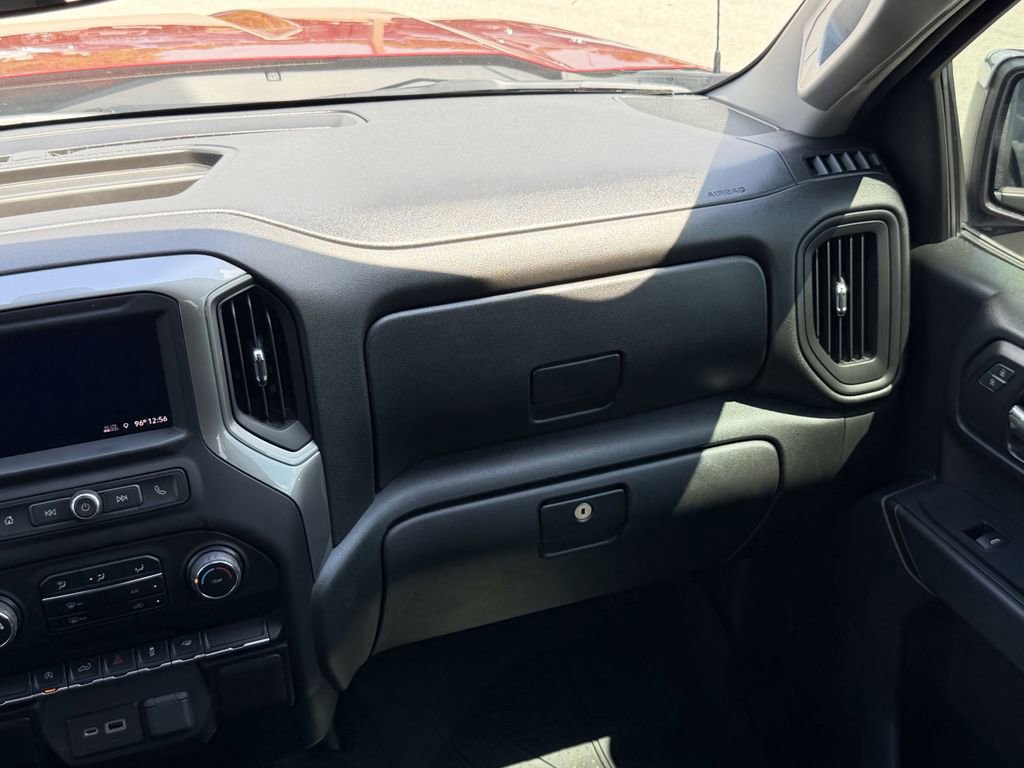 The exterior of this Silverado is adorned in a stunning Cherry Red Tintcoat color, giving it a bold and confident presence on the road. The Custom trim level adds a unique style with its body-color grille and bumpers, complemented by the 20-inch bright silver painted aluminum wheels.